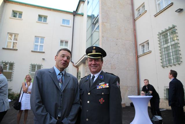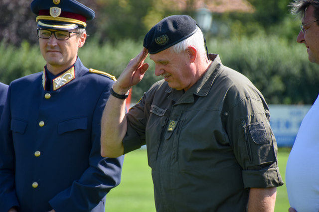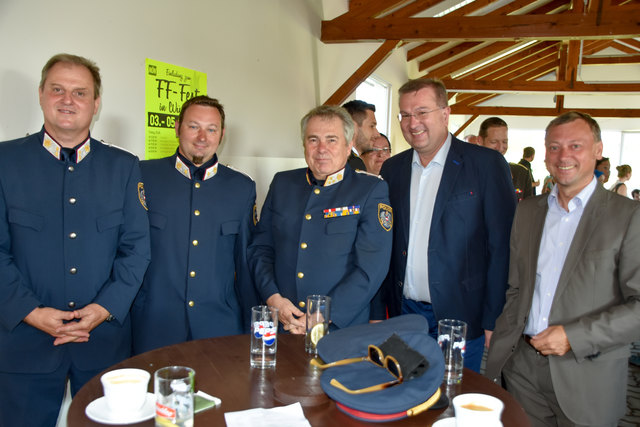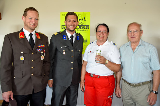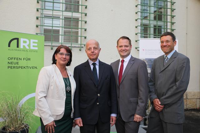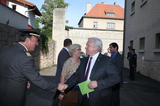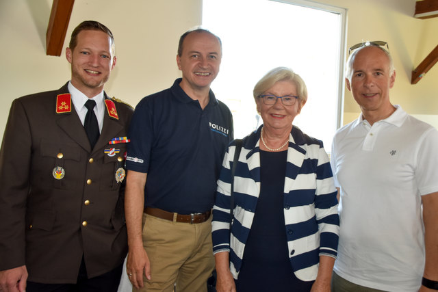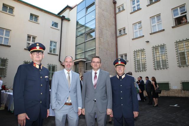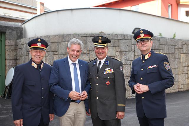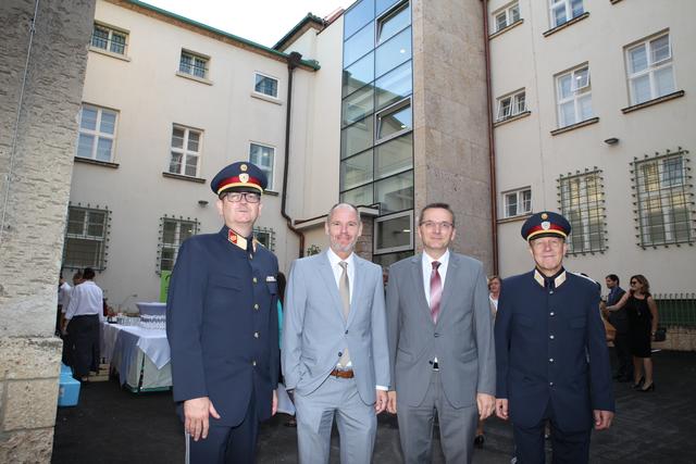 Oberstleutnant Romana Weinauer (Stv. Leiterin der Justizanstalt St. Pölten), Oberst Günther Mörwald (Leiter der JvA St. Pölten außer Dienst), Alma Zadic (Bundesministerin für Justiz) und der Neue Leiter Brigadeier Erich Huber-Günsthofer