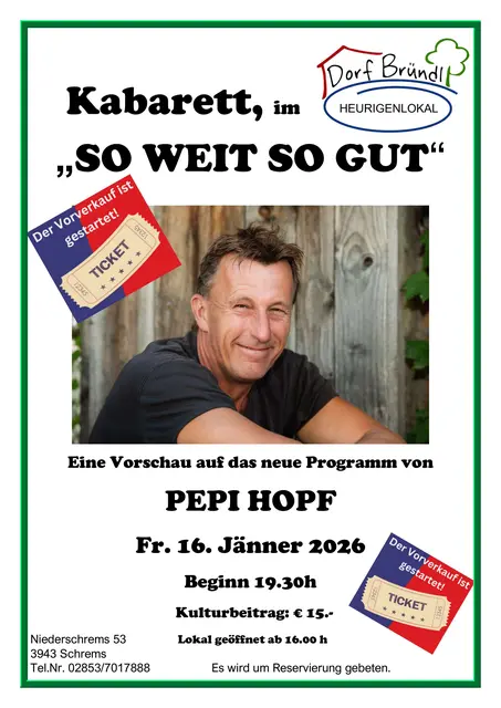 "SO WEIT SO GUT", Pepi Hopf schöpft aus dem Vollen ! 2 Stunden Vollgas mit den besten Geschichten der letzten Jahre. Das ganze zu einer Biografie verwoben, die fast seine eigene sein könnte. Da bleibt kein Auge trocken und kein Stein auf dem anderen. Sichere dir eine Karte!