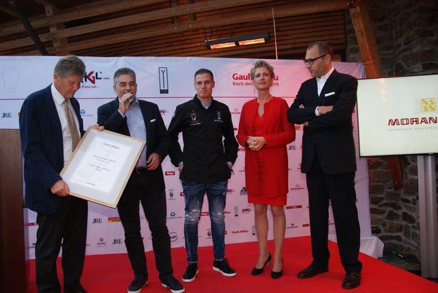 "Gault&Millau Koch des Jahres 2019": Karl Hohenlohe, Reinhard Hanusch (LOHBERGER), Preisträger Benjamin Parth, Martina Hohenlohe und Laudator Christian Seiler (v.l.). | Foto: YSCLA-Stüva/APA-Fotoservioce/Lechner