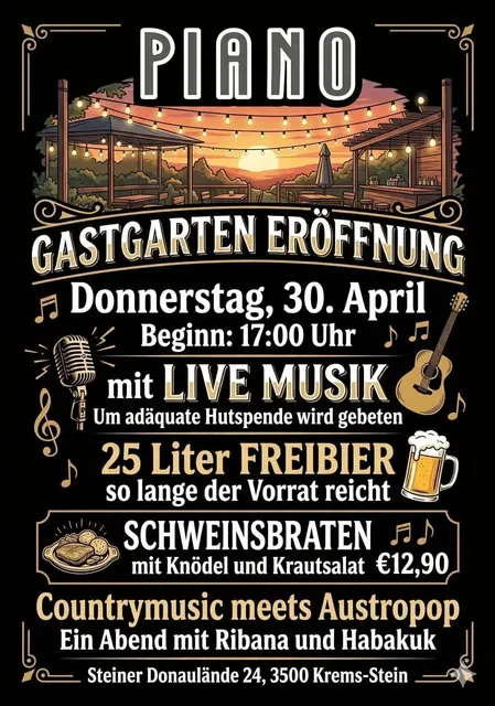 Das Kult-Beisl Piano eröffnet am 30.4.2026 seinen Gastgarten. Zur Feier des Tages gibt es 25 Liter Freibier (so lange der Vorrat reicht) sowie Schweinsbraten mit Knödel und Krautsalat zum Aktionspreis. Umrahmt wird der Abend vom Duo Ribana & Habakuk mit Live Musik unter dem Motto "Countrymusic meets Austropop".