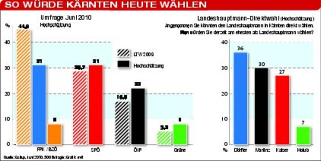 Gallup-Umfrage vom Juni sieht FPK auf dem Weg der Erholung, SPÖ stagniert. Martinz vor seiner Partei. Im März veröffentlichte Umfragen ließen noch auf ein Wegbrechen der FPK schließen – das BZÖ durfte damals bei der „Sonntagsfrage“ mit 12–14 Prozent rechnen, die FPK mit 19–21 %. Drei Monate später ist die Politlandschaft wieder im Umbruch. Das zeigt eine Gallup-Umfrage im Auftrag der ÖVP, die der WOCHE vorliegt. Würden kommenden Sonntag Landtagswahlen stattfinden, käme die FPK unter dem...