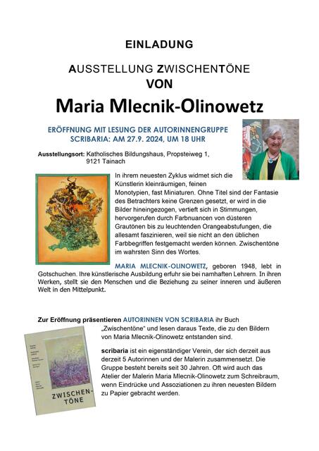 Maria Mlecnik-Olinowetz stellt im Katholischen  Bildungshaus Tainach ihre neuesten Bilder aus. Kleinräumige, feine Arbeiten in der spannenden Technik der Monotypien.  Die Künstlerin arbeitet seit Jahren mit den Literatinnen von scribaria zusammen und so entstehen hochinteressante Synergien, wo sie entweder zu Texten malt, oder die Autorinnen sich in ihr Atelier begeben, um zu ihren Bildern zu schreiben. Diese Zusammenarbeit gibt es schon viele Jahre lang und beflügelt beiderseitig die...