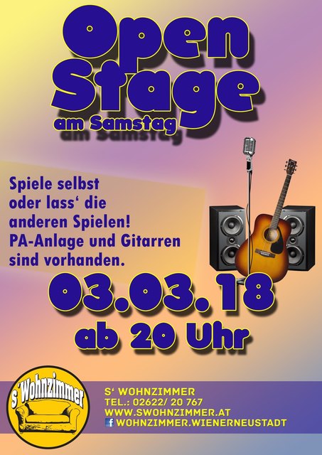 Der erste Samstag im Monat gehört Musikern und anderen Künstlern - also rauf auf die Bühne  s´Wohnzimmer wo die Gemütlichkeit daheim ist  Wann: 03.03.2018 20:00:00 Wo: s´Wohnzimmer - Bar, Haggenmüllergasse 4, 2700 Wiener Neustadt auf Karte anzeigen