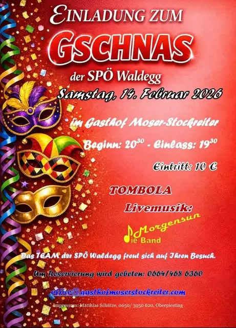 Gschnas der SPÖ Waldegg Samstag, 14. Februar 2026 Einlass: 19:30 Uhr Beginn: 20:30 UhrLivemusik von "Morgensun - die Band", Eintritt: € 10,- (um Reservierung wird gebeten: Tel.: 0664-4686360)