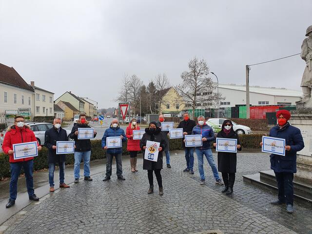 Die Grünen neben der von ihnen beanstandeten Straße in Gänserndorf Süd: Rainer Hynek, Harald Hirsch, Margot Linke, Marianne Aschenbrenner, Bettina Bergauer, Wolfgang Gangl, Margit Huber, Andy Vanek, Evelyne Senftner, Beate und Jürgen Kainz. | Foto: Grüne