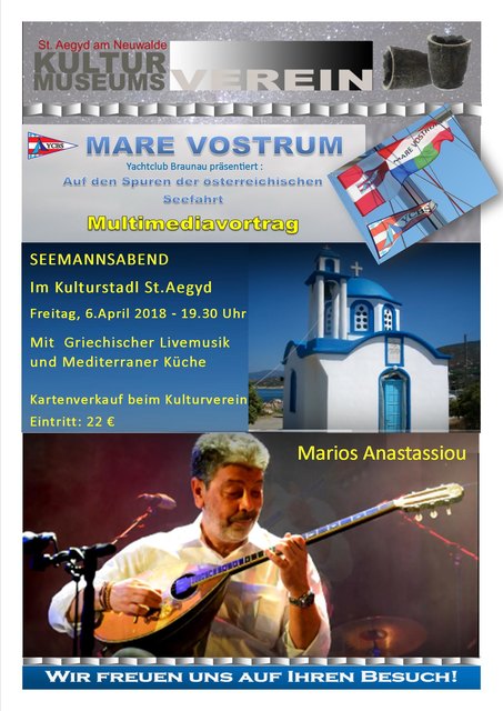 Auf Einladung des Kulturvereines brachte der Yachtclub Braunau-Simbach (YCBS) den zeitgeschichtlich wertvollen und mit dem Miramarpreis ausgezeichneten Vortrag "Mare Vostrum" In Braunau hatte die k. u. k. Marineakademie ihre letzten Standort. Das war für die Yachtclubmitglieder Christian Heidinger und Gerhard Nagy mit ein Grund, an der vor rund 100 Jahren bestehenden Marineakademie mit einem ORF Bericht, Ausstellungen und einem eigenen Buch an diese Zeit zu erinnern. Mit angereist war auch...