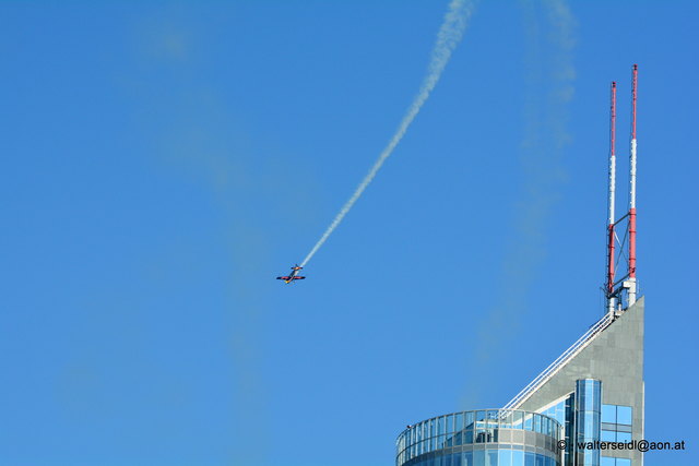 Kunstflug entlang der Donau im Bereich der Brigittenau. Je nach Perspektive möchte man glauben der Millenium-Tower steht hier im Weg. Das Kunstflugprogramm wurde während einer Pause vom Rockkonzert auf der Donauinsel durchgeführt Wo: Milleniumtower, Wien auf Karte anzeigen