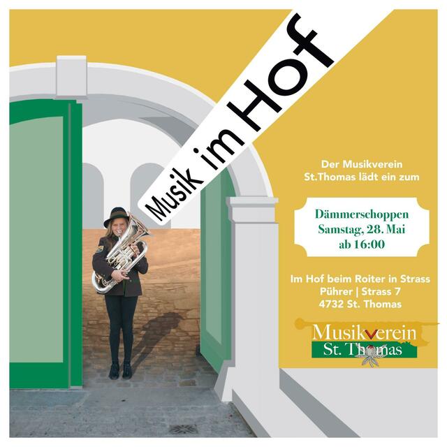 Fünf Jahre sind bereits vergangen seit der letzten musikalischen Veranstaltung des Musikvereins St. Thomas an dieser wunderschönen Location. Ursprünglich für das Frühjahr 2020 geplant, musste das Konzert sowie der Frühschoppen verschoben werden. Und nun wird dies endlich nachgeholt: Der Musikverein St. Thomas lädt am Samstag, den 28. Mai, zum Dämmerschoppen im schönen Vierkanthof beim Roiter in Strass vulgo Pührer ein (Adresse: Straß 7, 4732 St. Thomas). Wie schon im Frühjahr 2017 wird es dort...