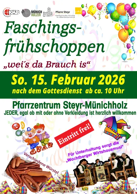 STEYR-MÜNICHHOLZ. Unter dem Motto „wei’s da Brauch is“ lädt die Katholische Männerbewegung (KMB) Steyr-Münichholz am Sonntag, 15. Februar, zum traditionellen Faschingsfrühschoppen ins Pfarrzentrum Münichholz ein. Im Anschluss an den Gottesdienst, der gegen 10 Uhr endet, sind alle Besucherinnen und Besucher herzlich willkommen – ganz gleich, ob kostümiert oder nicht. Für die musikalische Umrahmung sorgt die Wachtberger Wirtshausmusi, die mit schwungvollen Klängen für beste Stimmung sorgen wird....