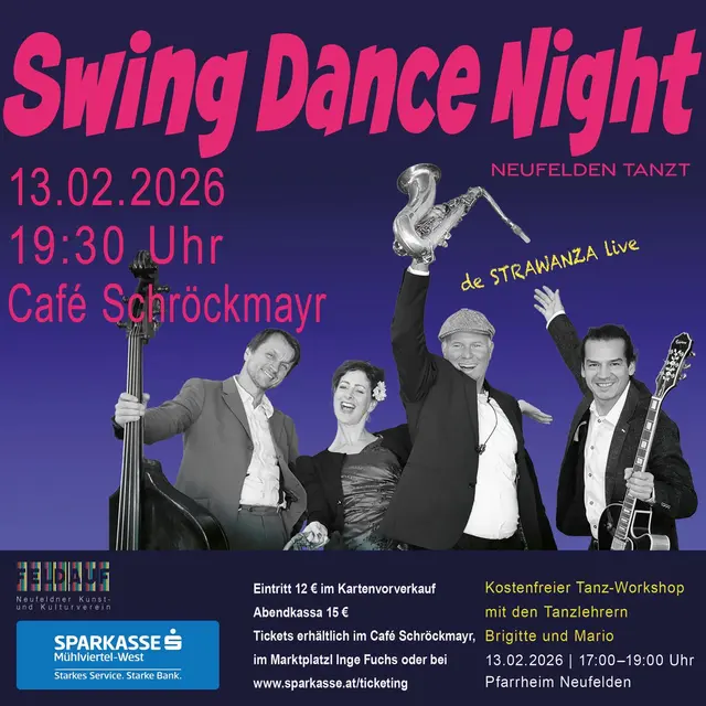 Auch in diesem Jahr wird wieder im Cafe Schröckmayer getanzt! Feiern wir gemeinsam den Fasching mit SWING! Wir laden euch herzlich zu unserem Swing-Dance-Abend ein. Egal ob Lindy Hop, Balboa, Shag oder Nichttänzer– bei uns ist jede/r willkommen. • Wann: 13.02.2026, ab 19:30 Uhr ; • WORKSHOP für SWING-DANCE beginnt am 13.2.2026 um 17:00 Uhr im Pfarrsaal Neufelden           (kostenlos für Besitzer von Eintrittskarten) • Wo: Cafe Schröckmayr, Markt 30, A-4120 Neufelden • Musik: "De Strawanza" mit...