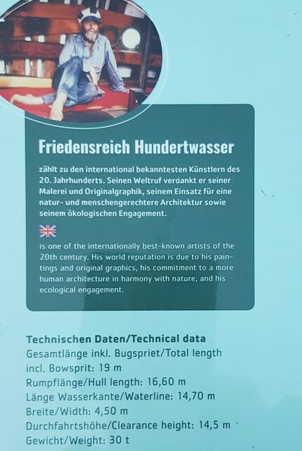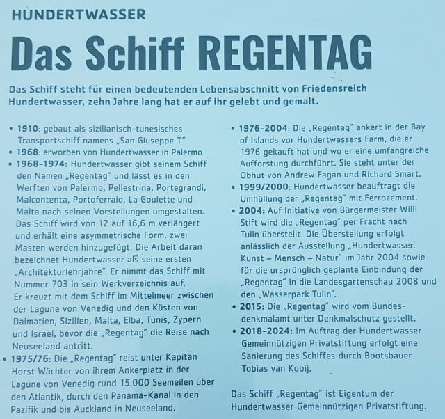 Tulln. Egon Schiele (1890 - 1918) ist hier im Bahnhofsgebäude zur Welt gekommen. Es gibt en eigenes Schiele-Museum. Des Malers Friedensreich Regentag Hundertwasser (1928 - 2000) verblüffend kleines Ozeanschiff steht hier im Hafen. Zuerst glaubt man gar nicht, dass der berühmte Künstler und Umweltschützer mit dem von Neuseeland, seiner zweiten Heimat, aus große Fahrten unternommen hat. Die Donauufer-Promenade heißt Schiele-Weg. Das Schiff, das einmal 16 000 Seemeilen schaffte, heißt nach...