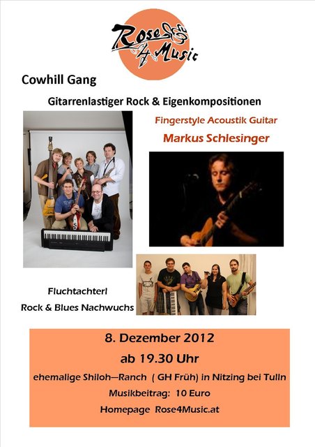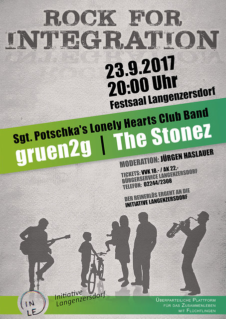 23. September, 20 Uhr, Festsaal Langenzersdorf Organisator und Top-Gitarreros Martin Kohlmann rockt auch heuer den Festsaal. Sgt. Potschka's Lonely Hearts Club Band, gruen2g und the Stonez werden die Stimmung anheizen. Nach dem letztjährigen, erfolgreichen Benefizkonzert, rocken auch heuer drei Bands unter dem Motto „Rock for Integration“ für den guten Zweck. Sgt. Potschka´s besteht aus drei Freunden, die, geprägt von den Songs der Beatles, nun das musizieren, was sie damals mit Begeisterung...