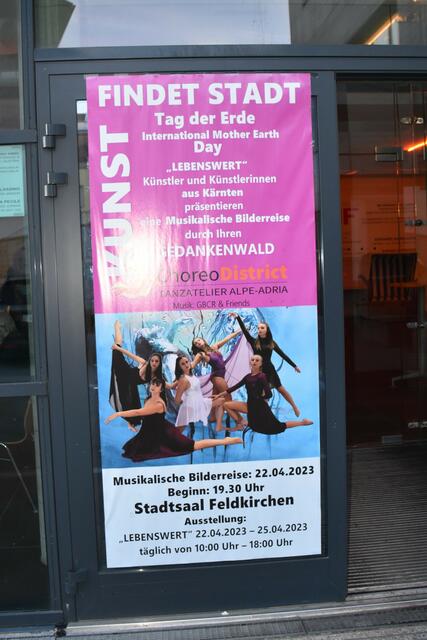 Am Tag der Erde (22. April 2023) fand im Stadssaal Feldkirchen die Ausstellung Lebenswert und die Aufführung der Gedankenwald statt. Mehr als 30 Kärntner Künstler der Bildenden und Darstellenden Kunst zeigen ihre Werke. Die Tänzerinnen der ChoreoDistrict - Tanzatelier Alpe-Adria führten als visuelle Reiseführer in den Gedankenwald. Die Ausstellung "Lebenswert" kann man noch bis Dienstag den 25. April 2023 zwischen 10 Uhr und 18 Uhr besuchen.