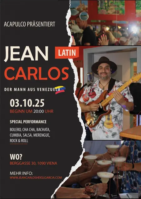 Jean Carlos der Mann aus Venezuela LIVE! Freie SpendeLive musik mit Jean Carlos, zum Mittanzen und Zuhören. Bachata, cha cha, merengue, salsa, cumbia, bolero und Rock and Roll. Gute Atmosphäre, Lassen Sie sich dieses Wochenend Highlight nicht entgehen und reservieren Sie Ihren Tisch