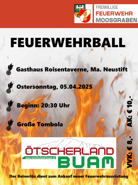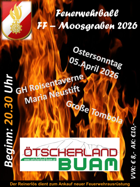 MARIA NEUSTIFT. Die Kameradinnen und Kameraden der Freiwilligen Feuerwehr Moosgraben laden am Ostersonntag, 5. April 2026, wieder zum traditionellen Feuerwehrball in das Gasthaus Großbichler „Roisentaverne“ in Maria Neustift ein. Die Moosgrabner Florianis werden an diesem Abend das Gasthaus Roisentaverne wieder zum Leben erwecken und vom Keller bis zum Dach in einen großen Ballsaal verwandeln. Für die passende musikalische Stimmung sorgen die „Ötscherland Buam“, die mit schwungvoller Tanzmusik...