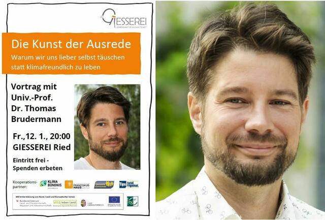 PREMSTÄTTEN. Am 29. Jänner ist um 19.30 Uhr im Festsaal Zettling Thomas Brudermann auf Einladung der Bibliothek Premstätten zu Gast. Der Autor des Buches „Die Kunst der Ausrede“ zeigt auf, warum kollektiver Selbstbetrug für eine enkeltaugliche Zukunft keine Option ist. Der Psychologe kennt unzählige Ausreden, wenn Klimaschutz zu anstrengend wird, und erklärt mit Humor, was dahinter steckt. Vortrag und Diskussion, freier Eintritt.
