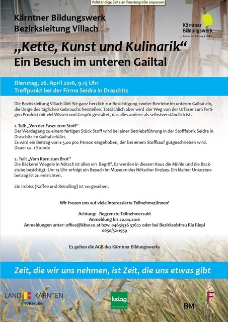 Ein Besuch im unteren Gailtal Die Bezirksleitung Villach des Kärntner Bildungswerks lädt Sie ganz herzlich zur Besichtigung zweier Betriebe im unteren Gailtal ein, die Dinge des täglichen Gebrauchs herstellen. Tatsächlich aber wird der Weg von der Urfaser zum fertigen Produkt mit viel Wissen und Gespür gestaltet, das alles andere als selbstverständlich ist. 1. Teil: "Von der Faser zum Stoff" Der Werdegang zu einem fertigen Stück Stoff wird bei einer Betriebsführung in der Stofffabrik Seidra in...