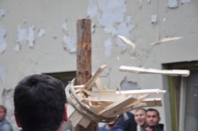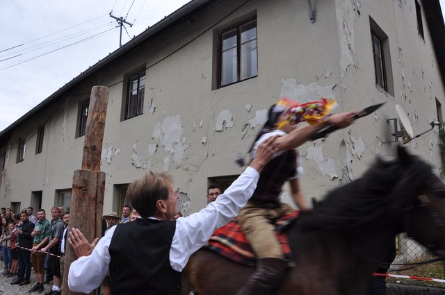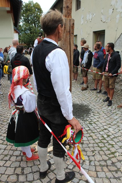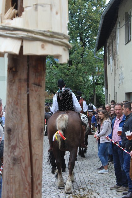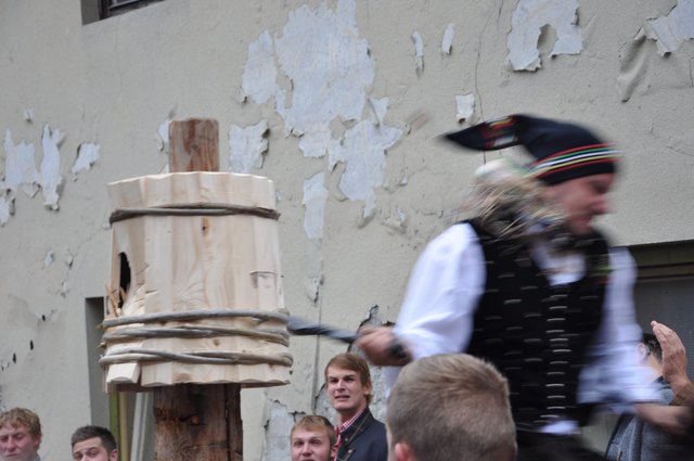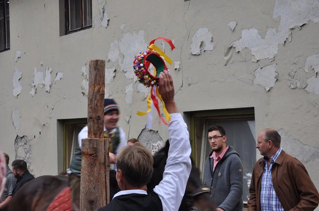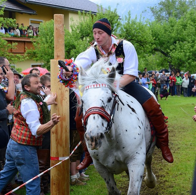 Einziges Ziel der jungen Reiter auf ungesattelten Pferden ist es, die an der Spitze eines Pfahles befestigte Holz-Kufe im wilden Vorbei-Ritt zu zerschlagen. Wer es schafft, erhält das begehrte "Kranzl" und führt als Sieger die Dorfschönste zum Lindentanz