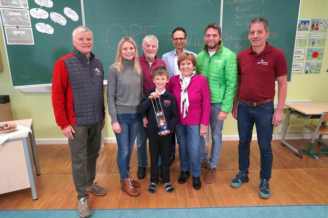 i nach re: Manfred Spitzbart, Nina Grafinger Mutter, Uropa Ferdl Grafinger, Friedenslichtkind Matthias Secklehner, Uroma Maria Secklehner, ORF Günther Madlberger,  Stefan Loidl und Franz Bracher