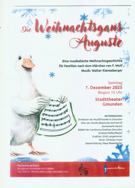 Die Geschichte der Weihnachtsgans Auguste Von F. WOLF, Musik von Walter KIENESBERGER wird am Sonntag 7.12.2025 mit Beginn 15:00 Uhr wird im Stadttheater Gmunden die Besucher begeistern. Mit dabei das Orchester der Musikfreunde in Gmunden, Chor der Musikvolksschule Gschwandt mir Annemarie Hauer, das Ballet der Landesmusikschuel Gmunden, dem Erzähler Erich Langweiler und der Tenor Christian HAVEL. Die Gesamtleitung hat Klaus Pesendorfer inne. Diese Geschichte passt ganz genau zum Beginn der...