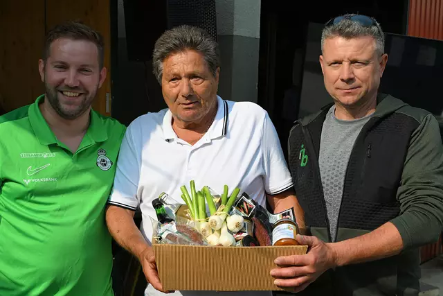 Im Rahmen des Fußballturniers am Pfingstmontag in der Hiesbergarena des HFC Matzleinsdorf wurde dem Gründer und Ehrenobmann des HFC Josef Mitterer zu seinem 80. Geburtstag, den er natürlich auf dem Fußballplatz verbrachte von Obmann Martin Spanseiler und Obmann a.D. Martin Golias gratuliert. In der Hoffnung, dass er noch lange den HFC durch seine Besuche bei den Spielen beehrt, wurde ihm ein Geschenk im Namen aller Mitglieder des HFC überreicht. Bild: v.L.n.R. Obmann Martin Spanseiler,...
