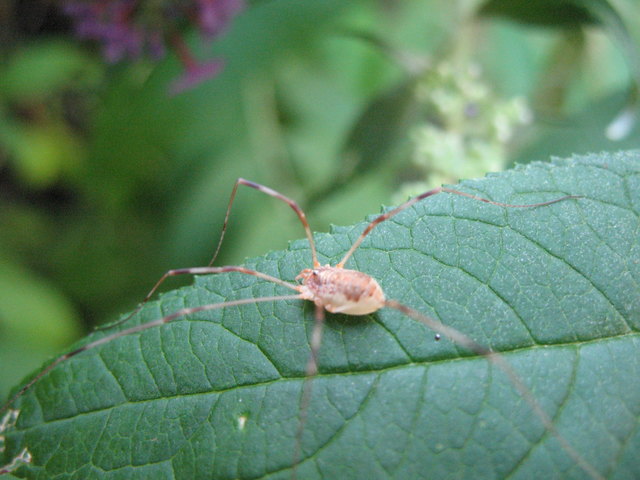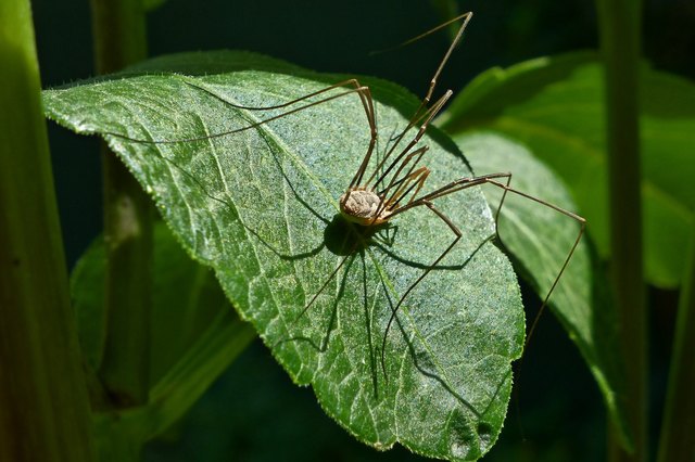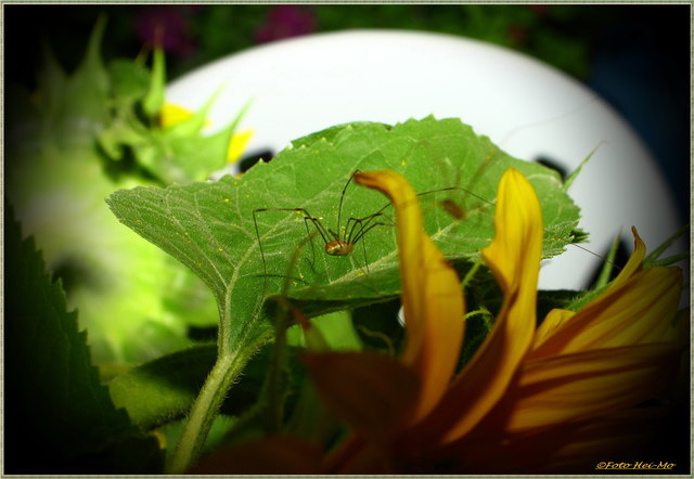 Auf einem Himbeerblatt sitzt eine Art des Weberknechts und blickt mich an. Ich sehe mir den Ruhenden näher an und erkenne, der hat so eine Art Gesicht!
