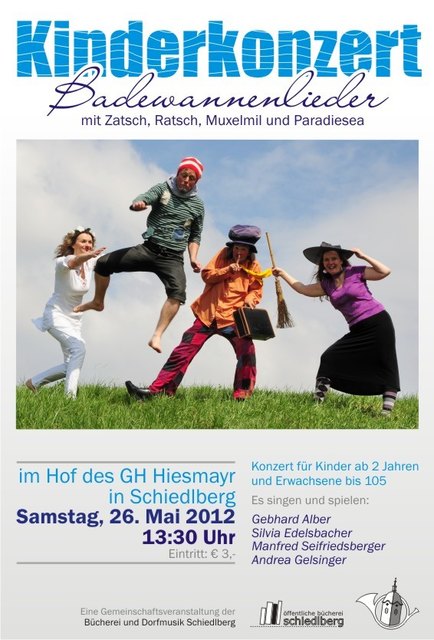 Zatsch (gespielt von Gebhard Alber), der größte Zwerg der Welt und seine Freunde der Riese Muxelmil, die Hexe Ratsch und die Fee Paradiesea (gespielt von der Schiedlbergerin Andrea Gelsinger) statten Schiedlberg einen Besuch ab. Veranstaltet wird dieses Konzert von der Bücherei und der Dorfmusik Schiedlberg am Pfingstsamstag, den 26. Mai 2012 um 13.30 Uhr im Hof des Gasthauses Hiesmayr (Eintritt 3€ für Groß und Klein). Die Protagonisten werden ihre neue CD "Badewannenlieder" präsentieren, mit...