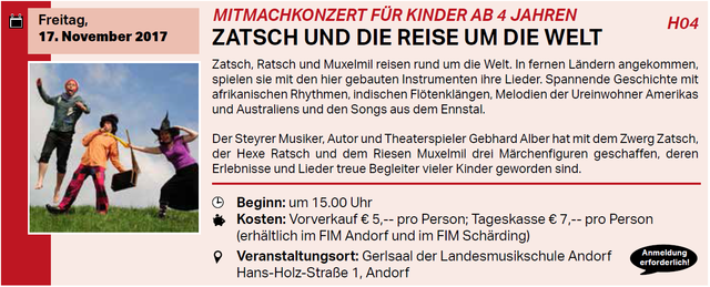 Mitmachkonzert für Kinder ab 4 Jahren siehe Beilage Wann: 17.11.2017 15:00:00 Wo: Gerlsaal Landesmusikschule, Andorf auf Karte anzeigen