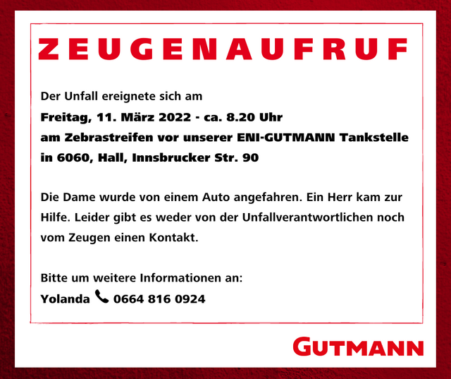Eine Frau wurde am 11. März  in Hall von einem Auto angefahren, vom Fahrer fehlt jede Spur. Die Polizei bittet Zeugen um Hinweise. HALL. Am Freitag, dem 11. März 2022 ereignete sich ein Unfall im Bereich des Zebrastreifens der Gutmann Tankstelle in Hall. Eine Frau wurde von einem Auto angefahren, vom Unfallverursacher fehlt jede Spur und auch Zeugen gibt es bis dato keine. Die Firma Gutmann sowie die Polizei bittet um Hinweise unter der Nummer 0664/ 8160924 Auf den sozialen Medien wurde ebenso...