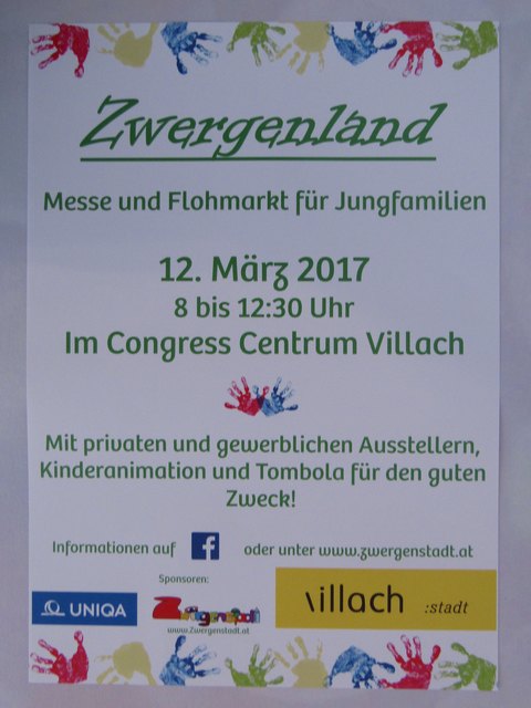 Am 15. September lädt die Zwergenmesse wieder zum tandeln, falschen, beratenlassen, schmökern und Informationen sammeln ein. Diesmal können stehen bis zu 60 Plätze zur Verfügung, wo private Aussteller ihre Ware anbieten und sich kleine gewerbliche Aussteller aus der Region präsentieren können. Geben wird es Alles rund um Schwangerschaft, Baby und Kind. EINTRITT FREI Wann: 15.09.2018 08:00:00 bis 15.09.2018, 12:00:00 Wo: Congress Center, Europaplatz 1, 9500 Villach auf Karte anzeigen