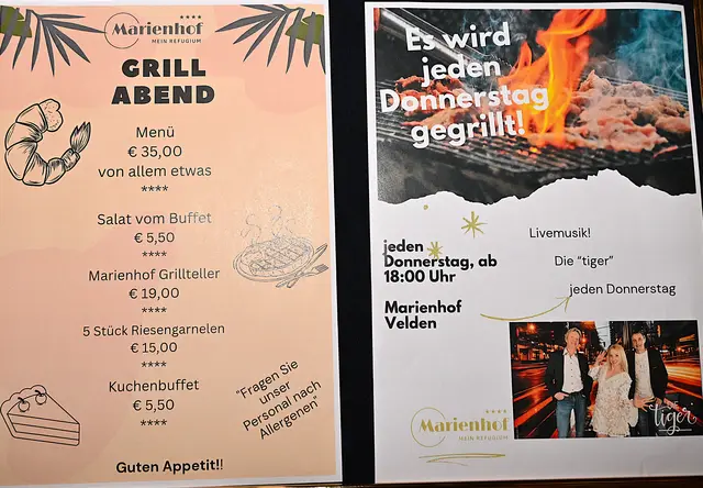 Urlaubsgäste und Einheimische schätzen diese Kombination aus Grillgenuss, Livemusik und sommerlicher Atmosphäre gleichermaßen. Vom saftigen Steak bis zu knackigem Gemüse und frischen Beilagen – die kulinarischen Angebote sind abwechslungsreich und laden zum Genießen ein. Gleichzeitig füllt die Musik von „Die Tiger“ den Marienhof mit Energie, sodass jeder Besuch zu einem besonderen Erlebnis wird.