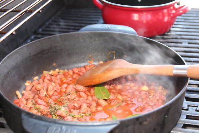 Bohnen, Weißwein, Geflügelfond dazugeben, Kräuter hinein und Deckel schließen