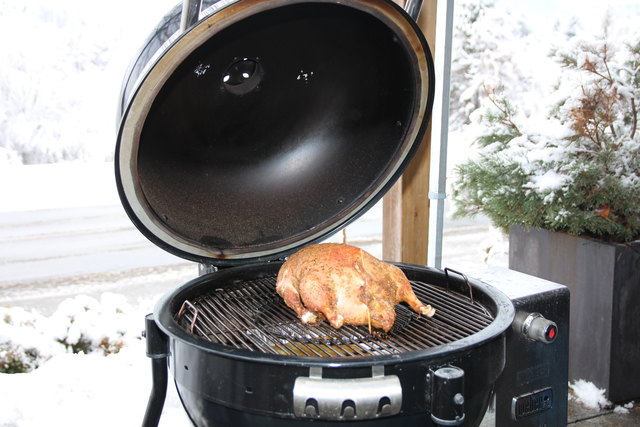 Grundsätzlich funktioniert das Grillen im Winter genauso wie im Sommer. Ein nicht unwesentlicher Unterschied ist allerdings der rapide Temperaturabfall im Griller, wenn man den Deckel anhebt. Die Hitze ist rasch weg und es dauert seine Zeit, bis die nötige Temperatur im Griller wieder erreicht wird. Je nach Ausstattung des Grillers kann man seine Gäste im Winter mit einer geräucherte Sellerie-Rahmsuppe oder bei ausreichend vorhandener Geduld sogar mit einer gefüllten Gans beeindrucken. Genauso gut funktionieren aber Steaks oder Schweinefleisch-Spieße. Der Phantasie sind wie auch im Sommer keine Grenzen gesetzt.