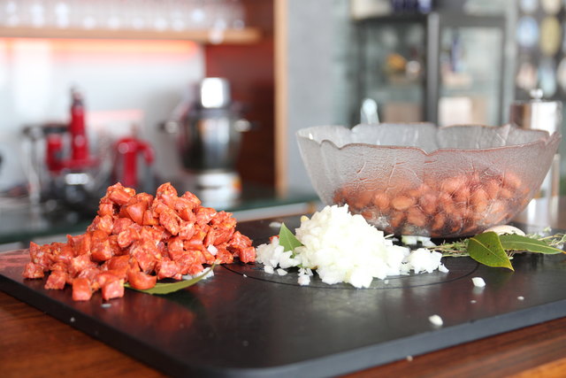 Vorbereitung: Chorizo enthäuten, würfelig schneiden