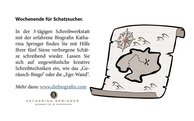 Ein Wochenende für Schatzsucher. In der 3-tägigen Schreibwerkstatt mit der erfahrene Biografin Katharina Springer finden Sie mit Hilfe Ihrer fünf Sinne verborgene Schätze schreibend wieder. Lassen Sie sich auf ungewöhnliche kreative Schreibtechniken ein, wie das „Geräusch-Bingo“ oder die „Ego-Wand“. Sanfte Entspannungs- und Bewegungseinheiten runden das Programm ab. Die beschauliche Stille des Klosters bietet viel Raum für die schriftliche Auseinandersetzung mit der Vergangenheit, um unseren...