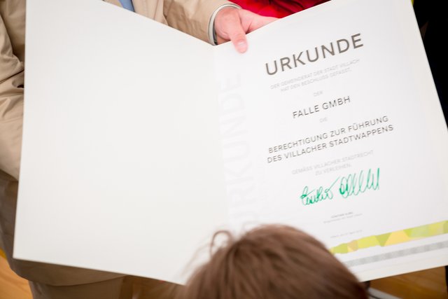 Im Rahmen der Feierlichkeiten wurde dem Unternehmen Falle das Villacher Stadtwappen überreicht. "Eine Auszeichnung", so der Bürgermeister Günther Albel, "die man nicht so leicht bekommt. Da bedarf es schon großer Leistungen für die Stadt Villach und die hat die Familie Falle natürlich reichlich erbracht."
