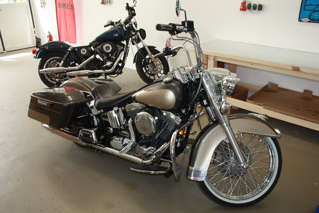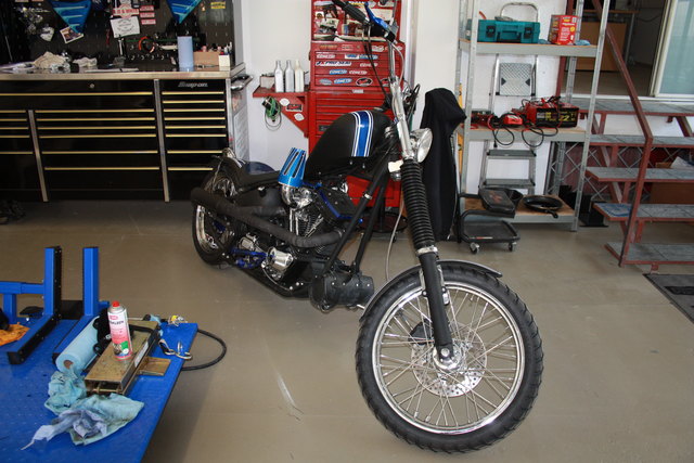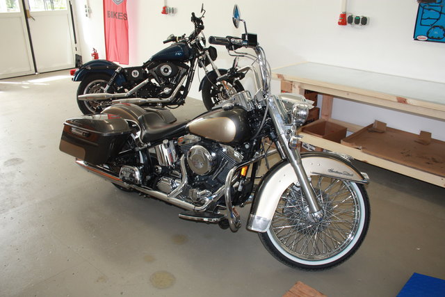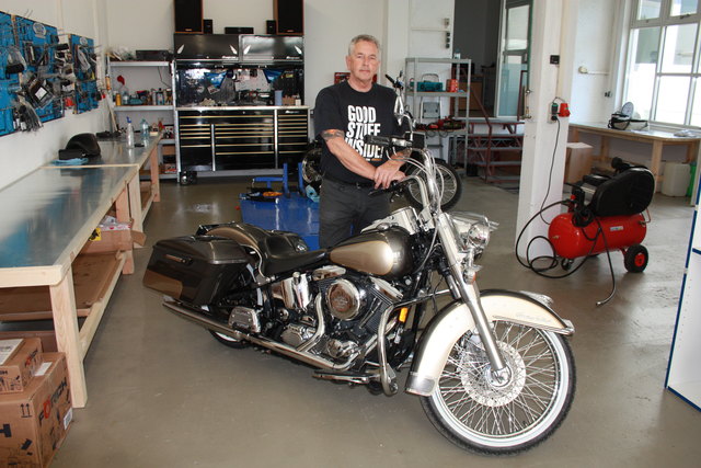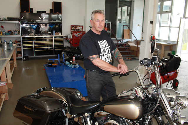 - Gerald Gruber mit einer gerade fertiggestellten Harley-Davidson eines Kunden die bereit ist wieder gefahren zu werden