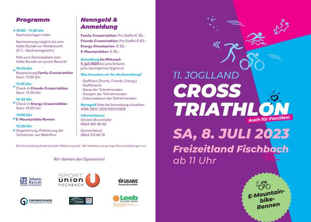 Sportunion Fischbach Nach einer längeren Pause findet am 08. Juli 2023 wieder der Joglland-Crosstriathlon im Freizeitland Fischbach statt. Hier wird der Spaßfaktor mit sportlichem Ehrgeiz gepaart. Die vier Bewerbe richten sich vor allem an alle Hobbysportler, Couchflüchtlinge und die, die gerne mit der Familie und Freunden gemeinsam Sport machen wollen.