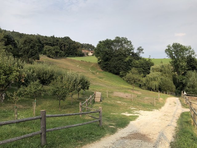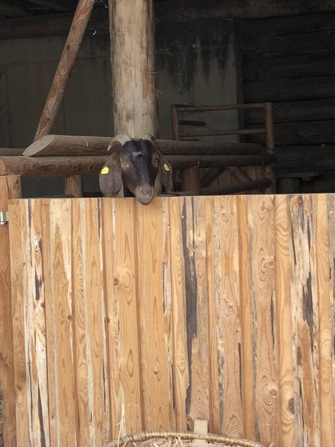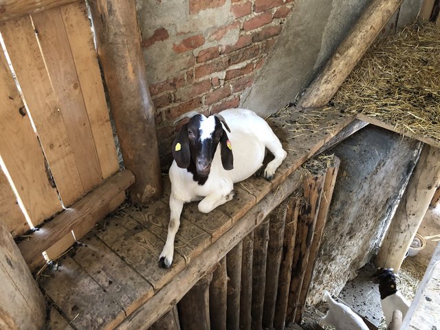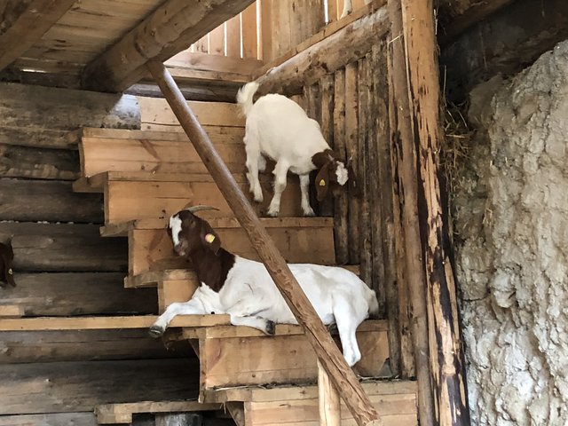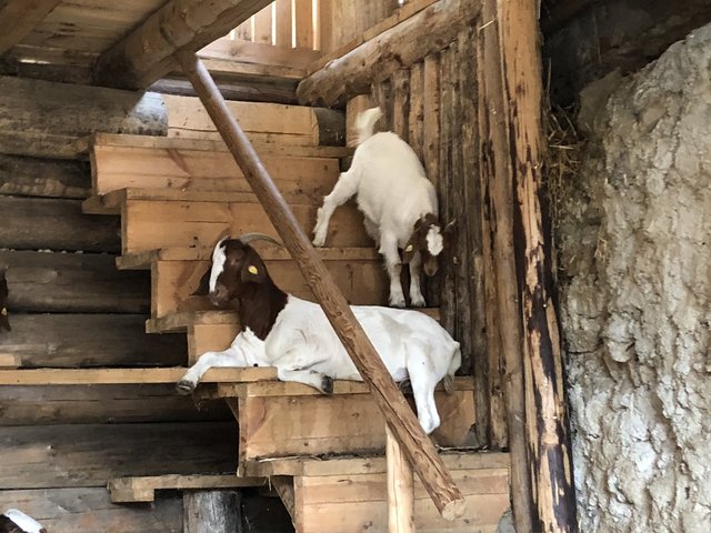 Heute sind die Ziegen-Damen im Stall und die Burschen auf der Weide. Auch sie kommen uns neugierig entgegen, scheinen sehr sanft und keine typischen "Sturböcke" zu sein.