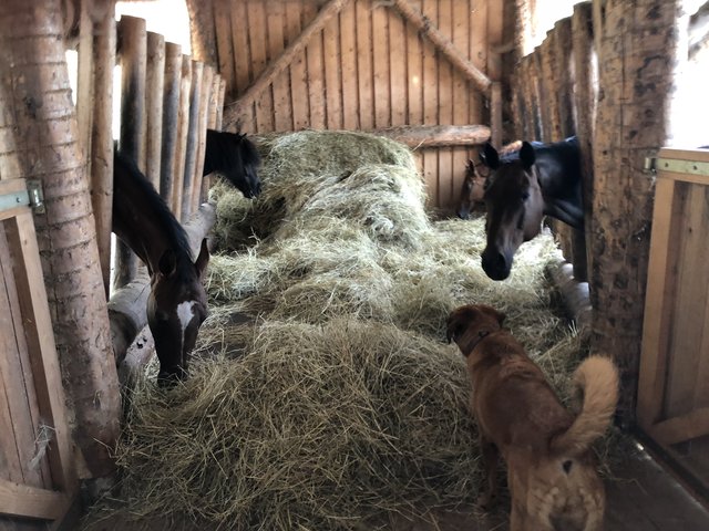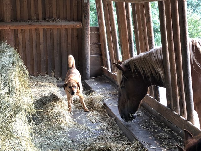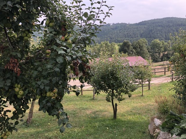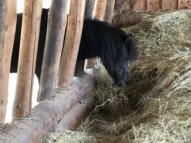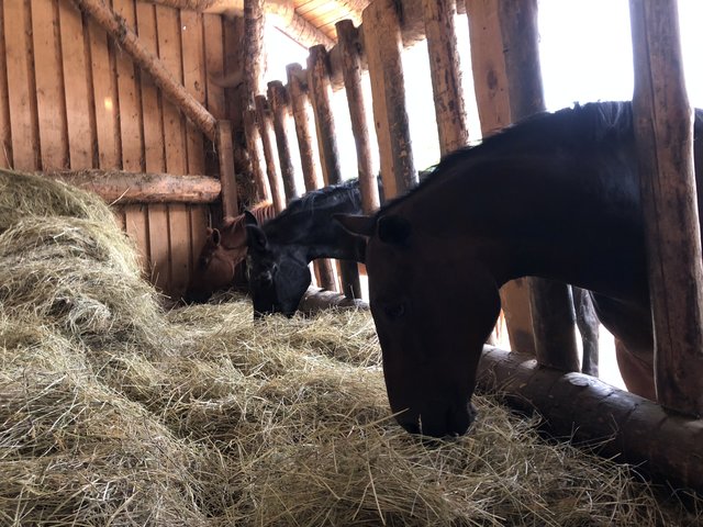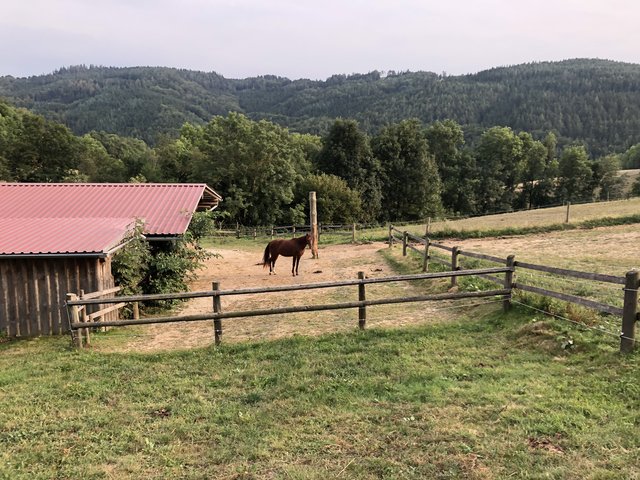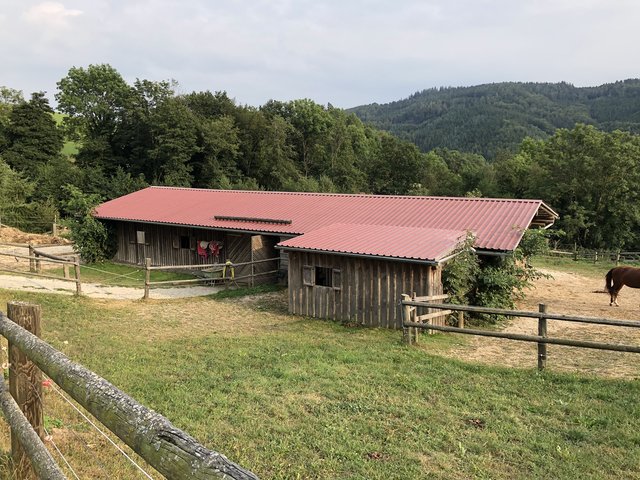 Totale Idylle, die sich auch beim Besuch im Offenstall der Pferde fortsetzt. Gemächliches Kauen am Heu, ein neugieriges Beschnuppern. Im Winter oder bei Regen verziehen sie sich in den sehr großzügigen offenen Stall, bei gutem Wetter bewegen sie sich lieber auf den riesigen Weiden. Ein Paradies der Natur und, nicht nur für das tierliebende Paar, ein Ort zum Wohlfühlen.