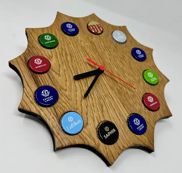 ZWETTL. Das Team rund um Werkstättenleiter Martin Ring präsentiert stolz die einzigartigen Bieruhren. Jede Uhr wird mit Zwettler Bier Kronkorken verziert und ist ein Unikat und das in liebevoller Handarbeit gefertigt wurde. Das Ergebnis sind Zwettler Bieruhren, die nicht nur funktional, sondern auch ein Stück Handwerkskunst aus Zwettl sind.